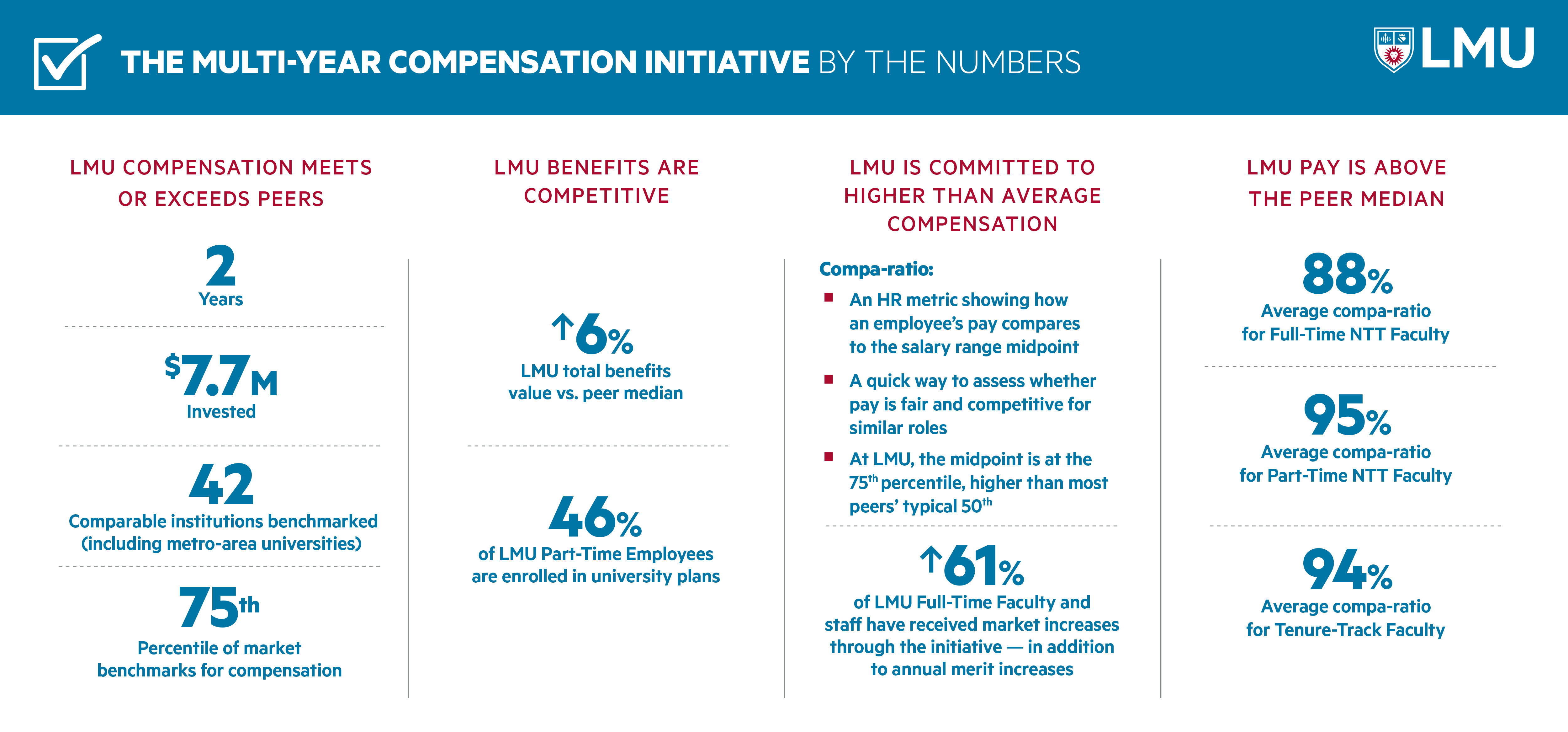 Market benchmarks are based on reputable third-party data and an analysis of 42 private institutions with comparable enrollment size and institution type, most recently reviewed in 2025. As part of the Multi-Year Compensation Initiative launched in 2023, LMU implements its salary ranges at the 75th percentile of the midpoint range of the market, versus the 50th percentile, creating higher pay opportunities across employee groups.