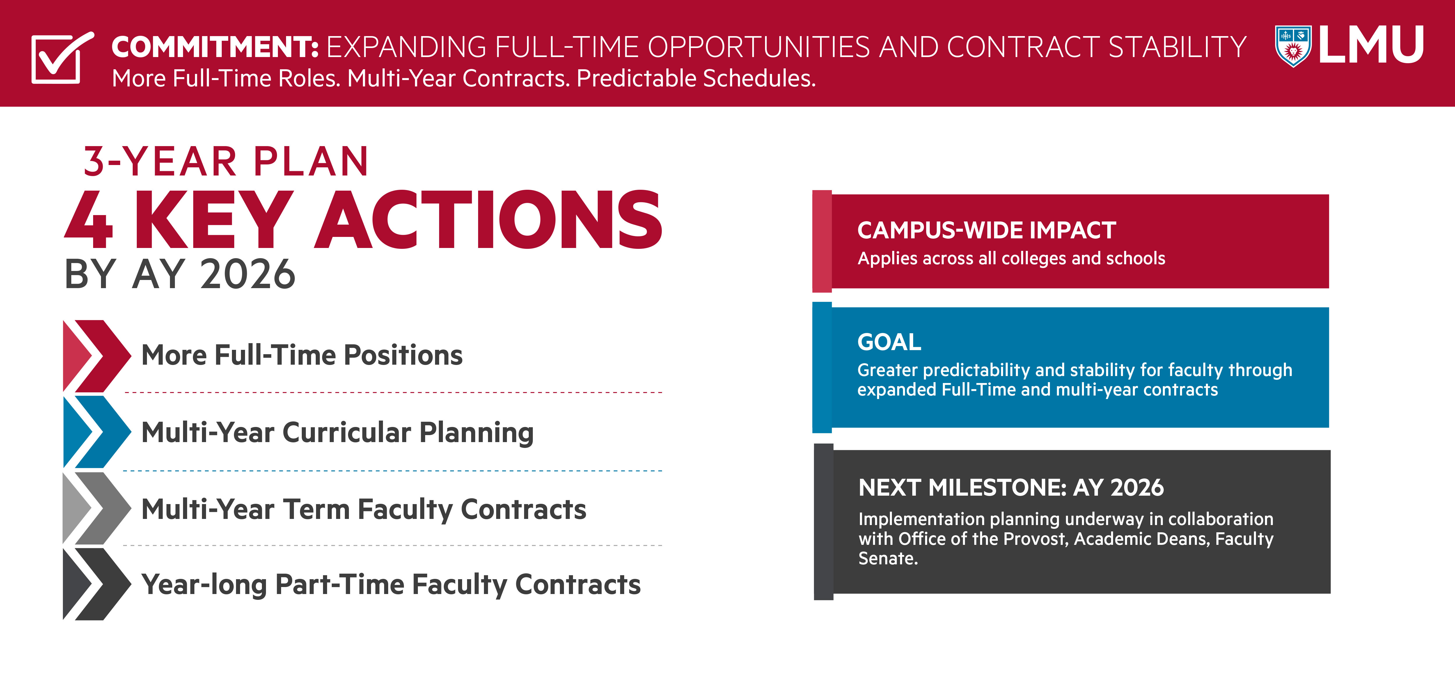Beginning in Academic Year 2026, LMU will launch a three-year plan to expand full-time faculty positions and strengthen contract stability across campus. Key elements include: