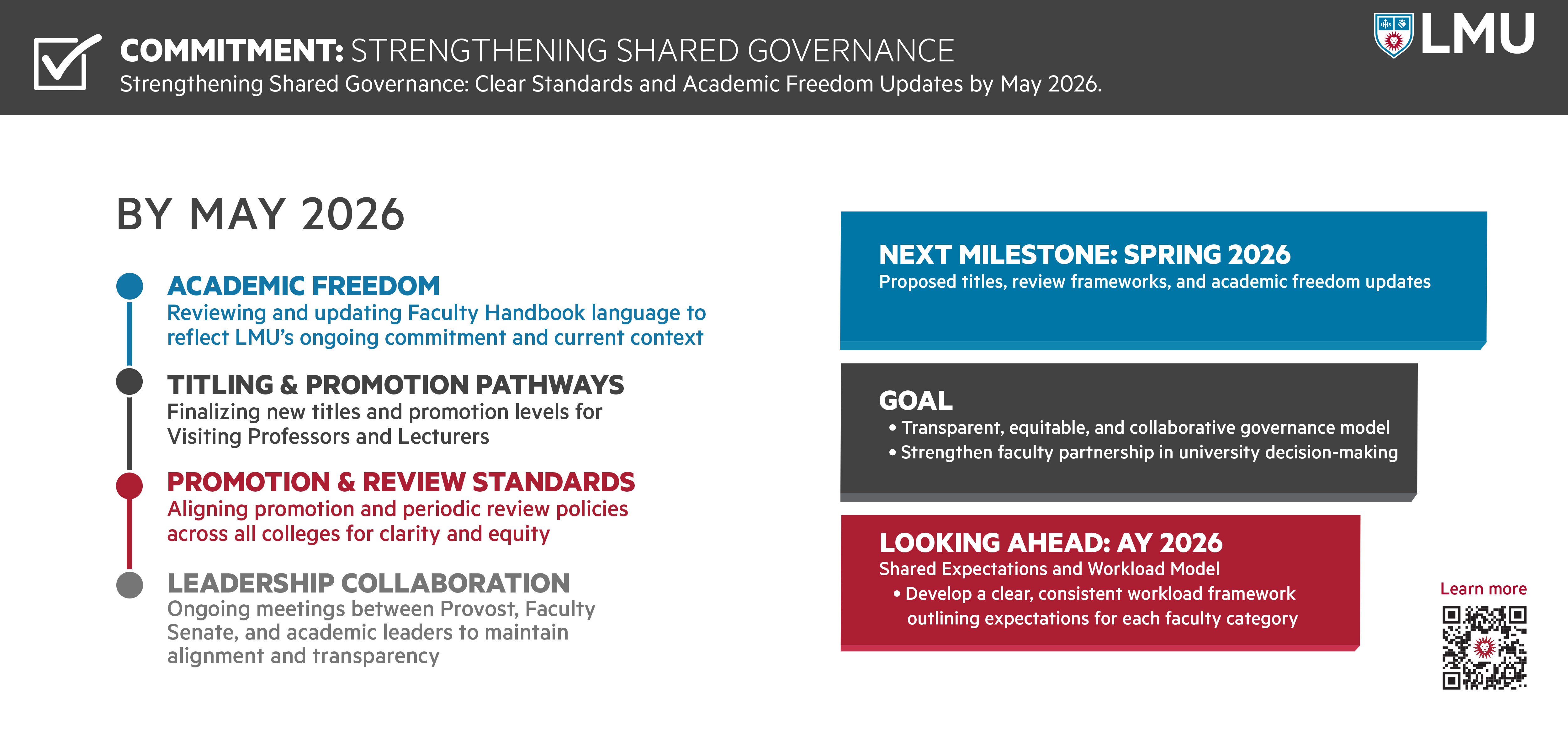LMU is committed to building strong partnerships with faculty through shared governance, collaboration, and clear pathways for growth. As we chart our path ahead, we will work more closely with the Faculty Senate and faculty committees to address priorities that enhance teaching, research, and student access.