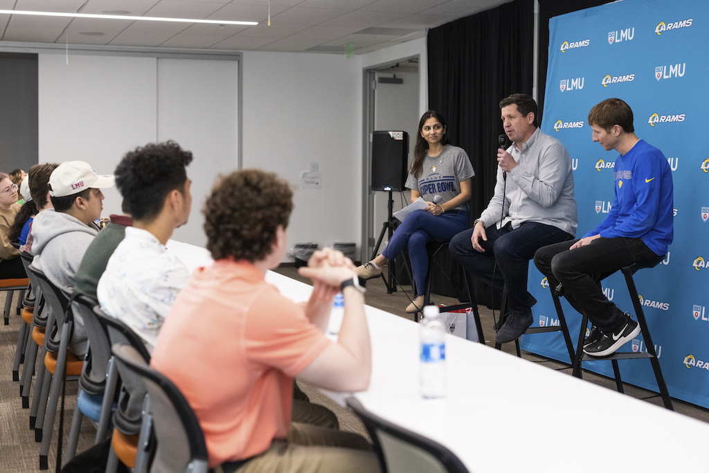 The group traveled to SoFi Stadium – only six miles away from LMU's Westchester campus -- and set up home base in the Rams locker room. Mollah set the stage for the two-day experience and various sessions planned, including the impact of supply and demand on the ticket market and prices, as well as various revenue sources such as concessions, merchandise, and corporate sponsors.
