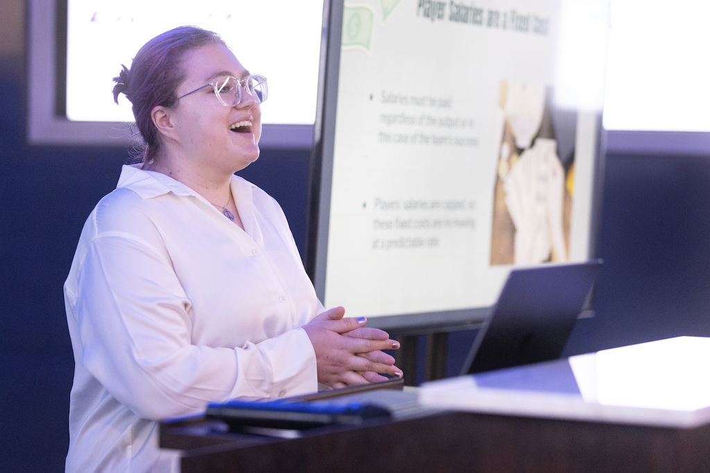 Students then had the opportunity to present their research to the group, focusing on topics such as ticket price determination in pro sports, the “superstar effect” and the relationship between individual productivity and pay.
